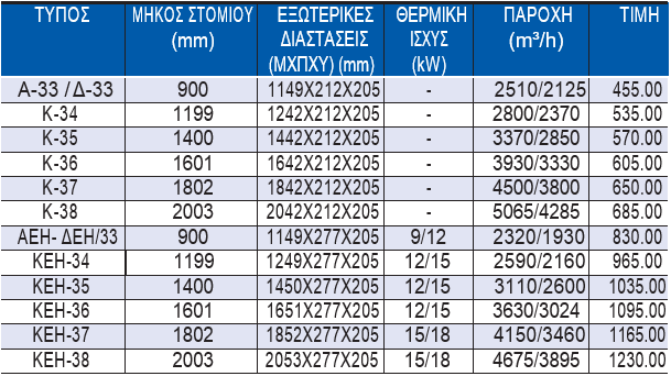 •Α, Δ, Κ : Απλές – ΑΕΗ, ΔΕΗ, ΚΕΗ : Θερμαινόμενου αέρα με ηλεκτρικές αντιστάσεις.