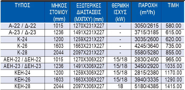 •Α, Δ, Κ : Απλές – ΑΕΗ, ΔΕΗ, ΚΕΗ : Θερμαινόμενου αέρα με ηλεκτρικές αντιστάσεις.